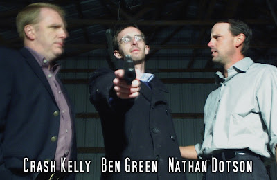 Nathan and I brought along some dress shirts so Ben could find the right ones for the scenes we’re shooting Saturday. Nathan (Sam) and I drilled our lines while Rusty was shooting some stills of the set. Ben was figuring out the lighting. It took us awhile to put together our make-shift card table and chairs from the scraps of things around the warehouse.