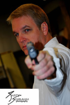 We did some make up shots a few nights ago with our new “Mr. Sweets” character, Michael Fox. And thanks to Jerry Tyroch for working late and allowing us to use his high dollar office on short notice to shoot that scene. Nathan Dotson and I brought a change of clothes to portray two FBI agents for a local rap artist music video. Bumbling feds, now THAT’S typecasting. Ben’s acting background definitely helped us all in this story. And the almost instant chemistry between Sam and Joe (I saw it in the rough edits)… awesome.