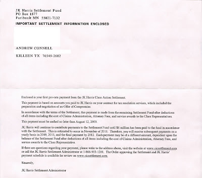 >I too only received one check from the settlement over a year ago for some feeble amount of $15.00. I paid J.K. Harris over $5,000 to aid in repairing my credit and make amends only to be let down. Then the Justice system did the same "let down" by allowing a Judge a "cartwheel" judgment for J.K. Harris toease out of their responsibilities with such a meager settlement. I can almost speculate that Harris will come up with some kind of "extension request" and claim they will go bankrupt if they have to pay the whole settlement by 2011. All the satisfaction I can get is telling everyone I meet about the whole scenario and let people make their own choice in choosing a tax service company. As of this date, I know I talked to over 65 people, couples or families about what happened to me and as far as I know, none of them hired Harris for their tax service provider. It gives me great satisfaction that I probably took over 300,000 of business away from those bastards. Hopefully, more people will read this and not go with Harris and maybe my goal of a million will be reached.